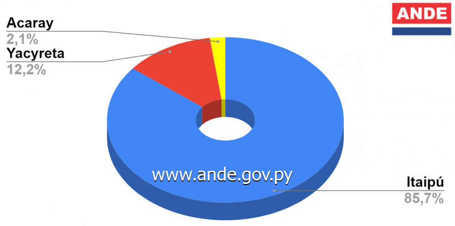 Cabe mencionar que de esta energía total consumida, la Itaipú Binacional aportó el 85,7% (9.928.180 MWh), la Entidad Binacional Yacyretá el 12,2% (1.410.732 MWh) y la Central Hidroeléctrica Acaray el 2,1% (244.452 MWh).