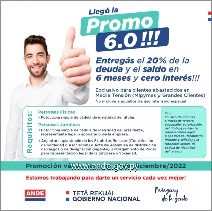 Acompañando las medidas impulsadas por el Gobierno Nacional, para la recuperación económica del país, la Administración Nacional de Electricidad, lanzó en la fecha, martes 30 de agosto del año en curso, la campaña denominada “PROMO 6.0” que entra en vigencia desde el 1 de setiembre al 31 de diciembre del cte., en donde los clientes con contratos activos e inactivos en Media Tensión, podrán acogerse a los beneficios y ventajas que consisten en la financiación de la deuda total acumulada (incluido el Recargo por Mora), con una entrega inicial mínima del 20 %, y el saldo en hasta 6 (seis) cuotas sin interés, cuya gestión podrá ser realizada de manera presencial o a través de la WEB o APP MI ANDE, mediante el fraccionamiento electrónico. Es importante señalar que dicha promoción no incluye a los clientes con uso intensivo especial de energía eléctrica (como minería de criptoactivos, blockchain, token y data centers, cuyo factor de carga se encuentre por encima del 80% en los últimos 3 meses).