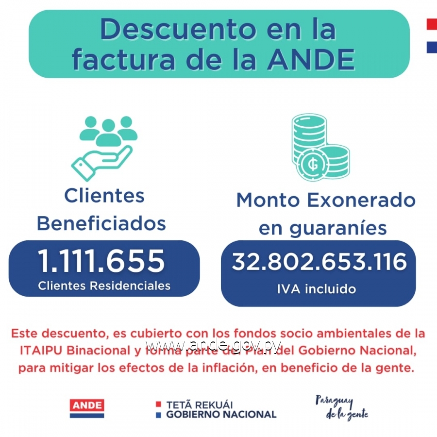Este descuento es financiado mediante los fondos socio ambientales de la Itaipú Binacional y forma parte de las medidas de recuperación económica impulsadas por el Gobierno Nacional para mitigar los efectos de la inflación.