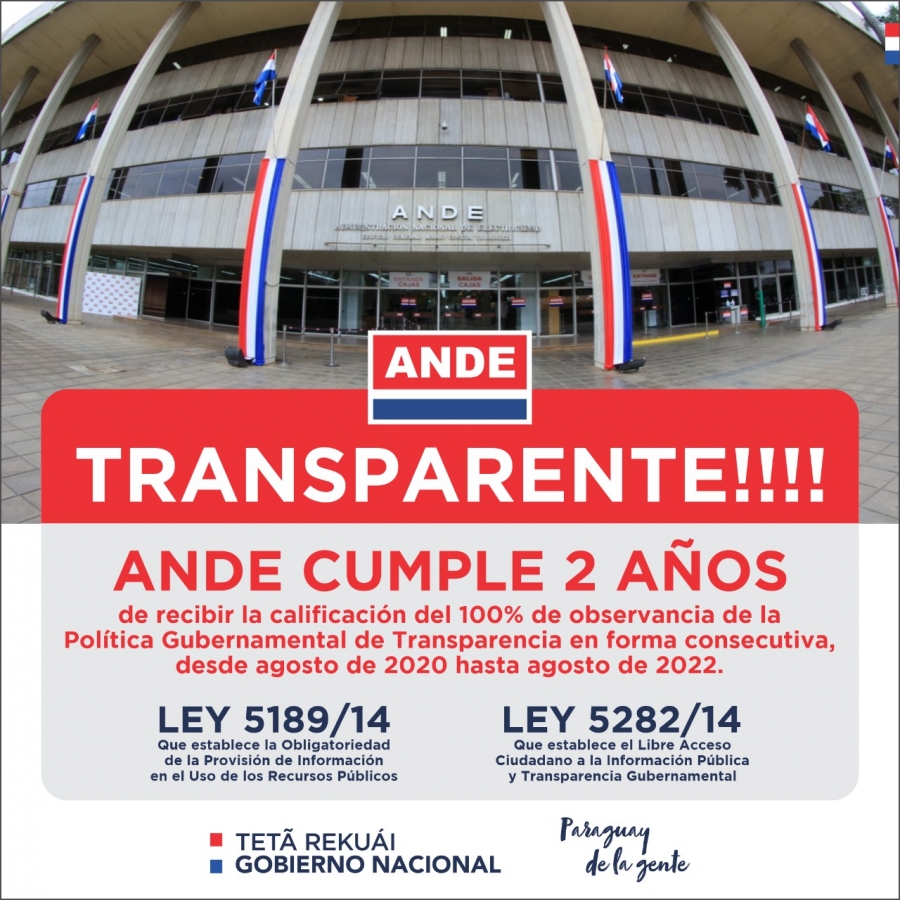 La Administración Nacional de Electricidad ha obtenido por segundo año consecutivo, desde agosto 2020 hasta agosto 2022, el reconocimiento y la calificación del cumplimiento del 100 % en la publicación en su página institucional, de lo estipulado en la legislación gubernamental de transparencia y de información pública a los ciudadanos.