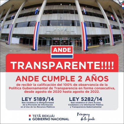 El cumplimiento de esta política se basa en el último reporte publicado por la SENAC en agosto del año en curso, en su portal https://senac.gov.py, y por la Secretaría de la Función Pública – SFP, en su página web https://www.sfp.gov.py, la ANDE logró posicionarse entre las empresas públicas que cumplieron nuevamente con el 100% de lo enmarcado en las mencionadas leyes de transparencia y el uso correcto de las recursos públicos.