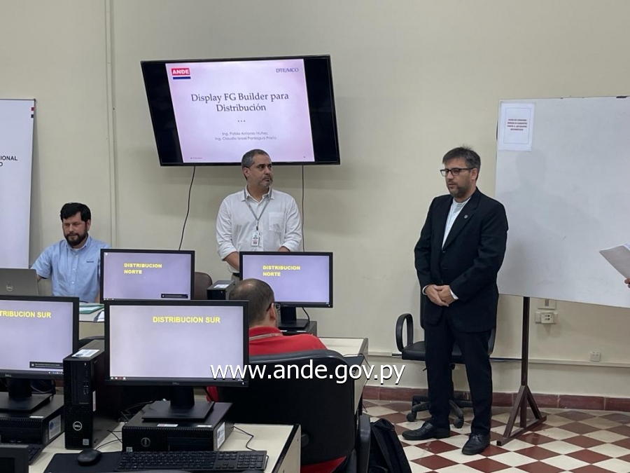 La apertura del curso que tiene por objetivo introducir a los funcionarios o responsables los conceptos, características y componentes de la herramienta Display FG Builder para elaboración de gráficos utilizados en los circuitos de Distribución, contó con la presencia del Director de Recursos Humanos, el Lic. Javier Bougerminni y del Director de Telemática, el Ing. Luis Poisson.
