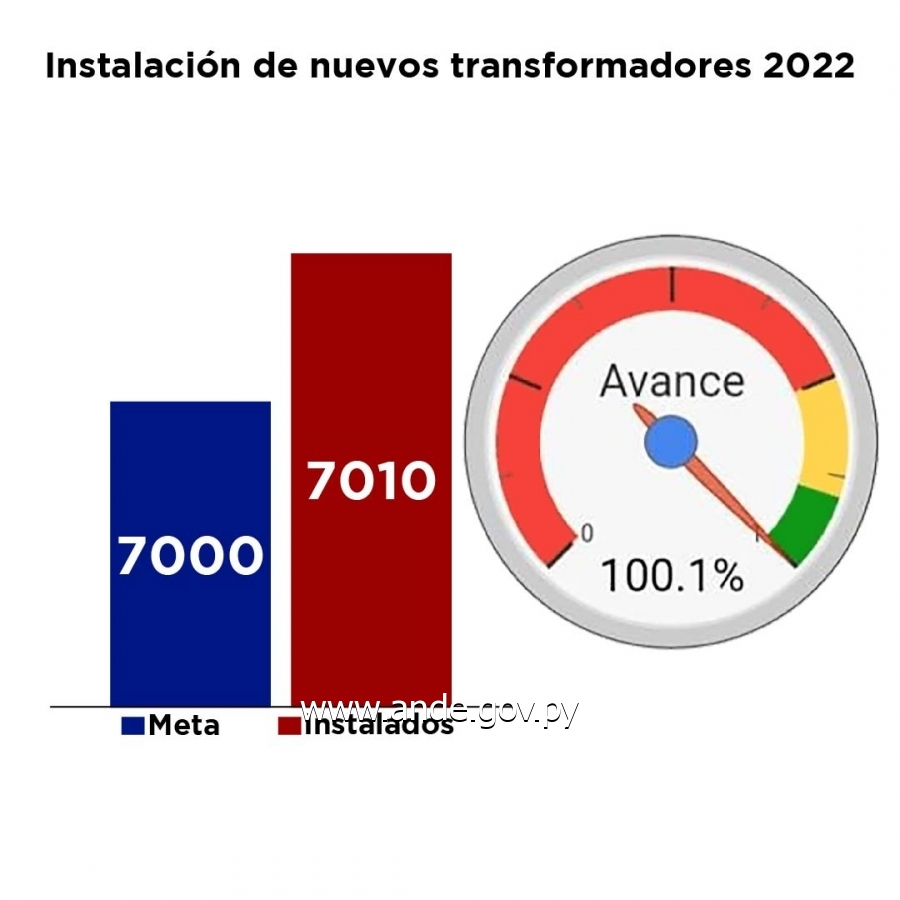 Es así que nuevamente este año, se instalaron 7.010 nuevos transformadores en todo el país, llegando a la fecha al cumplimiento del 100,1% de la meta prevista para el 2022, beneficiando de esta manera con un mejor servicio eléctrico a alrededor de 525.000 clientes a nivel país. La inversión total para la instalación de los 7010 nuevos transformadores asciende a 182.000 millones de guaraníes aproximadamente.