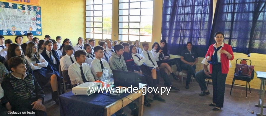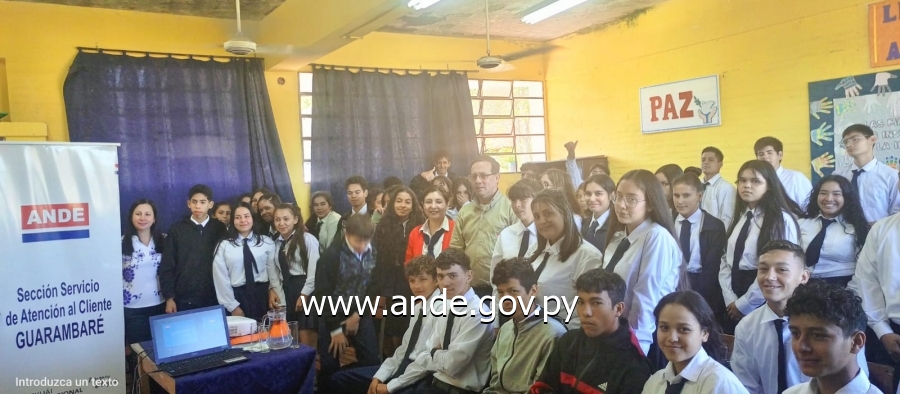 Continuando con las charlas informativas y educativas que la Administración Nacional de Electricidad realiza en diferentes instituciones educativas, en esta oportunidad se efectuó en el Colegio Nacional Avay de la ciudad de Villeta del Dpto. Central, en donde más de 70 alumnos del 2.º y 3.º año de la Media acompañados por la Lic. Mirian Arrúa, Directora del Colegio, fueron informados sobre los beneficios de la App Mi ANDE, el uso racional, eficiente y seguro de la energía eléctrica y el consumo de cada uno de los electrodomésticos.