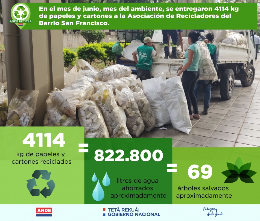 Prosiguiendo con el proyecto ANDE RECICLA, llevado a cabo a través de la Oficina de Implementación del SIGAS, para la valorización de los residuos y aprovechamiento de los mismos a través de la separación en origen, la Administración Nacional de Electricidad, a través de la Gerencia Financiera, entregó a la Asociación de Recicladores del Barrio San Francisco tres lotes de más de 4100 kg de papeles y cartones en desuso para su posterior reciclaje.