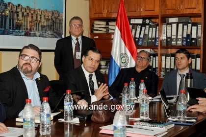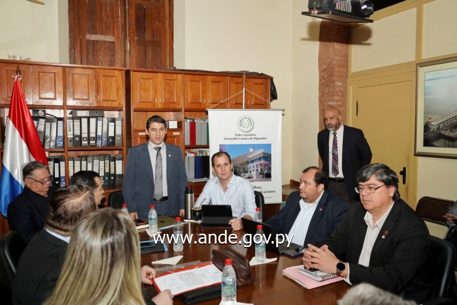 Continuando con el proceso de presentación y análisis de dos (2) proyectos de gran importancia para el fortalecimiento del sistema eléctrico del país, el Presidente de la ANDE, Ing. Félix Sosa, junto con el Director de Planificación, Ing. Tito Ocariz y el jefe de Gabinete, Ing. Luis Torres, se reunieron en la mañana de hoy, martes 25 de julio, con las comisiones de Obras, Servicios Públicos y Comunicaciones, y de Presupuestos de la Cámara de Diputados, para el análisis con los Diputados, de dos (2) importantes préstamos destinados a la construcción de dos Líneas de Transmisión para fortalecimiento del Sistema Eléctrico Paraguayo.