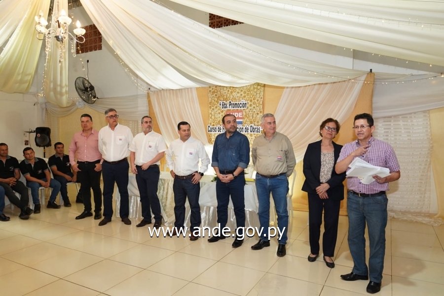 Hoy, martes 01 de agosto, se llevó a cabo en la ciudad de Caazapá la clausura del Curso de Capacitación de Fiscales de Obras de Distribución - Sexta promoción. El evento contó con la presencia del Presidente de la ANDE, Ing. Félix Sosa, ejecutivos de la Institución y jefes del área de Formación y Capacitación de la Dirección de Recursos Humanos, encargados de la capacitación.