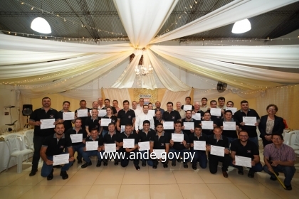 La entrega de los certificados a los egresados estuvo a cargo del Pdte. de la ANDE, Ing. Félix Sosa y de los directores de Gestión Regional, Ing. Gustavo Encina, de Recursos Humanos, Lic. Javier Buongermini, del Gerente Técnico, Ing. Miguel Báez, del Director de Distribución, Ing. Esteban Molinas, del jefe de División Regional Centro, Lic. Richard Rodríguez y la jefa de Departamento de Formación y Capacitación, la Lic. Ilda Páez.