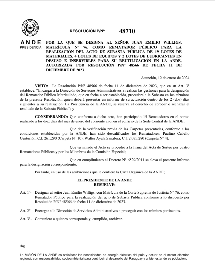 🔨En el marco del proceso de la Subasta Pública de materiales, equipos y lubricantes en desuso y no reutilizables por la ANDE, a ser realizada el sábado 20 de enero del 2023 a las 09:00 horas, en el Salón Auditorio, 2do piso de la Sede Central de la ANDE, ubicada sobre la calle Padre Cardozo y la Avda. España, ciudad de Asunción, se da a conocer la lista de empresas calificadas para participar en la subasta, así como la resolución P/Nº 48710 mediante la cual se designa al señor Juan Emilio Willigs, matrícula N° 76, como Rematador Público para llevar a cabo el acto de Subasta Pública de 19 lotes de materiales, 4 lotes de equipos y 2 lotes de lubricantes en desuso e inservibles para su reutilización en la ANDE, autorizada por resolución P/N° 48566 con fecha del 11 de diciembre de 2023.