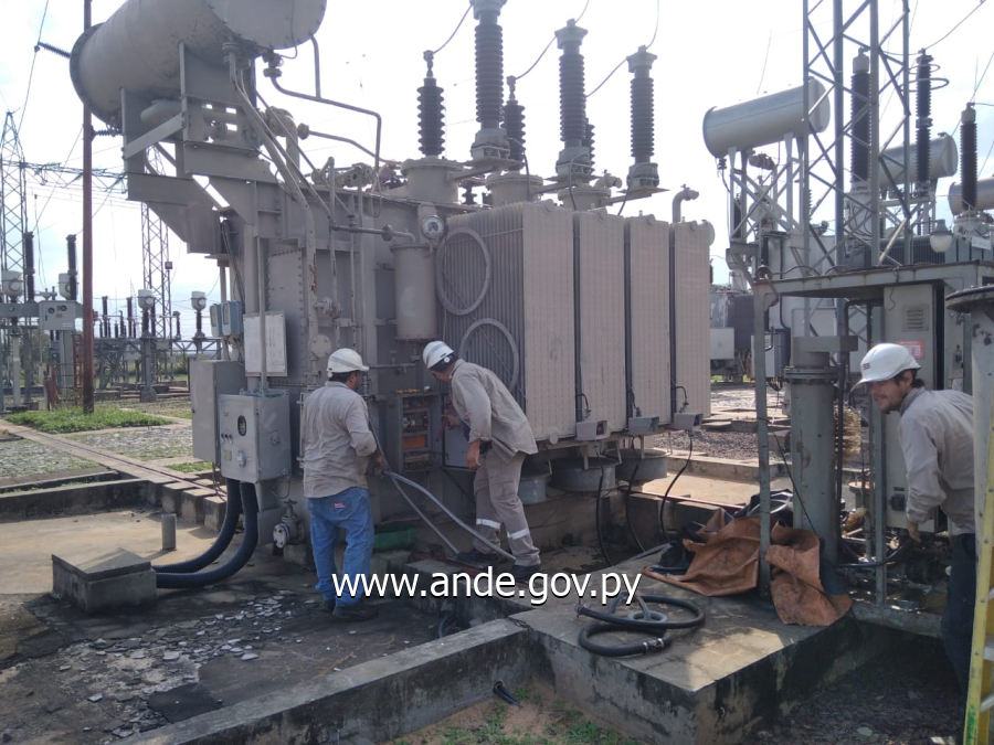 En el marco de las mejoras continuas a través de mantenimiento de equipos de potencia en subestaciones del sistema metropolitano, funcionarios de la Administración Nacional de Electricidad realizaron el mantenimiento preventivo de los equipos de transmisión en la subestación Guarambaré, en donde fue efectuando la instalación del sistema de enfriamiento en compensador de reactivos, el mantenimiento de un transformador de potencia para su óptimo funcionamiento, así como trabajos previos para la repotenciación con la desestiba del transformador de 220/23 kV y 42 MVA, en una nueva posición que se encuentra en adecuación.