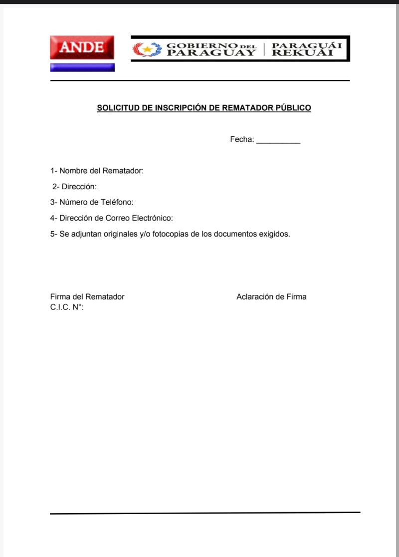 En cumplimiento de la Resolución P/Nº 51199, de fecha 11 de noviembre de 2025, de la Presidencia de la Administración Nacional de Electricidad (ANDE), y de conformidad con lo establecido en el Decreto de la Presidencia de la República N° 3471/2009, modificado por el Decreto N° 6529/2011, la ANDE convoca a los Rematadores Públicos interesados a inscribirse para el sorteo de designación de UN REMATADOR PÚBLICO TITULAR Y UN REMATADOR PÚBLICO SUPLENTE, quienes tendrán a su cargo la venta en Subasta Pública de 100 (cien) vehículos en desuso de la Institución, a realizarse en fecha a ser fijada posteriormente, en el predio del complejo ANDE Boggiani, sito en la Av. Dr. Guido Boggiani y Dr. Facundo Machain, Asunción, Paraguay.