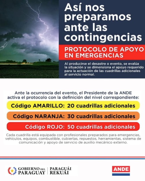 Ante la alerta de posibles tormentas de alta intensidad previstas desde la madrugada del miércoles 15 de abril, que afectarían a Asunción y gran parte del territorio nacional, la Administración Nacional de Electricidad (ANDE) se encuentra preparada para responder de manera rápida y eficiente ante eventuales contingencias que impacten el servicio eléctrico.