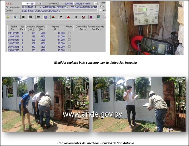 Por otro lado, se intervino un suministro identificado con NIS 1186960 que en el registro informático de la ANDE figura a nombre del Sr. Eusebio Quintana y se encuentra ubicado en Tte. Manuel Caballero Molinas N° 1483, de la Ciudad de Asunción. Durante la verificación se constató el hecho punible de sustracción de energía eléctrica por una derivación antes del medidor. Debido a que en el momento de la intervención se encontraba cerrada la vivienda, se solicitó el acompañamiento de la Oficina de Asistencia Jurídica a Intervenciones y acompañamiento policial, quienes labraron Acta Policial, dejando constancia de la situación. Posteriormente se labró Acta de Intervención y de Notificación y tras el procedimiento correspondiente, se normalizó el servicio.
