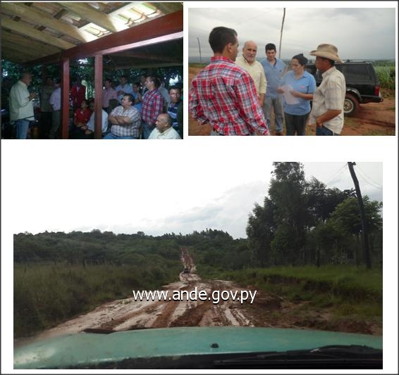 A pesar de la inclemencia del tiempo y las grandes dificultades del camino, el Presidente de la Administración Nacional de Electricidad (ANDE), Ing. Victor Romero Solis, acompañado de su equipo técnico, se trasladó hasta la ciudad de Tava`i, Dpto. Caazapá para reunirse con dirigentes sociales y pobladores de la zona, a fin de informarles el estado de los proyectos a ser ejecutados para la regularización de las conexiones clandestinas conectadas en forma precaria a las redes de Media Tensión.
