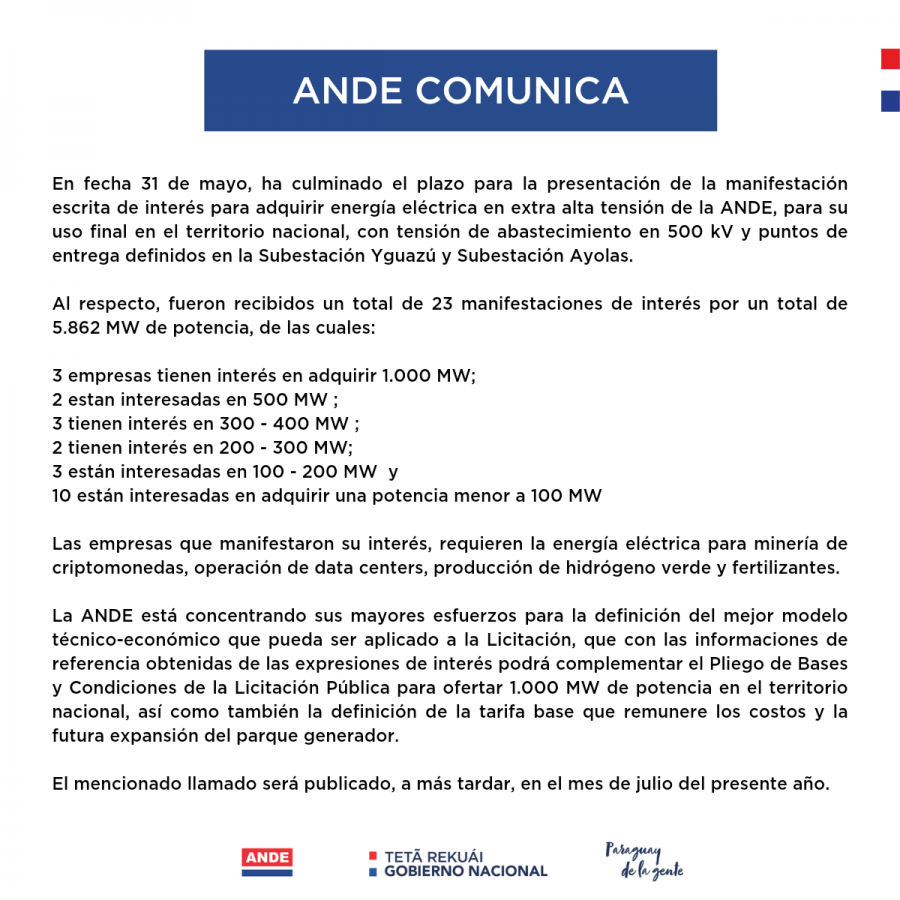 En fecha 31 de mayo, ha culminado el plazo para la presentación de la manifestación escrita de interés para adquirir energía eléctrica en extra alta tensión de la ANDE, para su uso final en el territorio nacional, con tensión de abastecimiento en 500 kV y puntos de entrega definidos en la Subestación Yguazú y Subestación Ayolas.