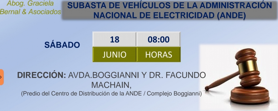 Se presenta en el siguiente catálogo, los vehículos que serán subastados el día sábado 18 de junio a las 08:00 horas, en la ANDE - Sede Boggiani (Avda. Boggiani y Dr. Facundo Machain).