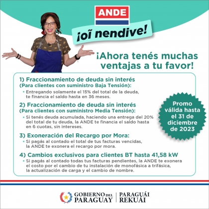 En beneficio de sus clientes en Baja y Media Tensión, ANDE lanza promoción “ANDE OI NENDIVE”