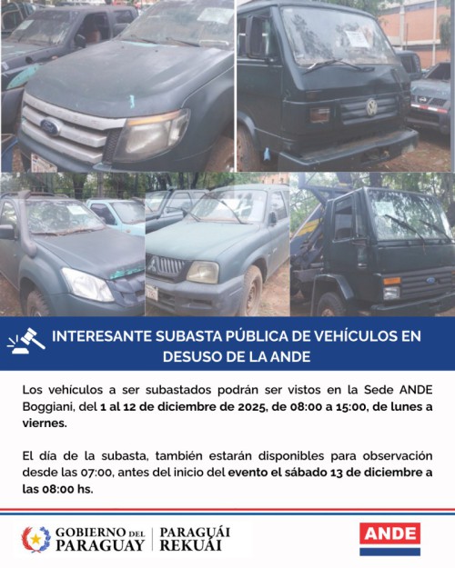 En fecha 13 de diciembre de 2025, a partir de las 08:00 horas, en el predio del Centro de Distribución de la ANDE / Complejo Boggiani, sito en la Avda. Guido Boggiani y Dr. Facundo Machain, por disposición de la Administración Nacional de Electricidad (ANDE), de conformidad a la Resolución P/Nº 51199/2025, sustentada en los Arts. 24° inc. h) y 63° de la Ley Nº 966/1964, se procederá a la Venta, a través de Subasta Pública, de 100 (cien) lotes de vehículos automotores en desuso, unidad por unidad, y en el estado en que se encuentran. A continuación se presenta un resumen de los vehículos a subastarse: