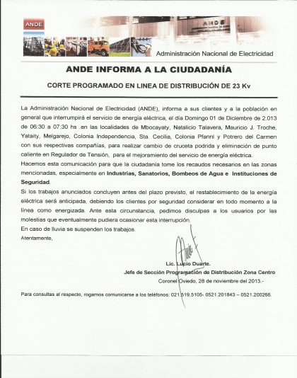 Se informa a la población en general que se realizarán trabajos de mejoramiento como eliminación de crucetas podridas y eliminación de puntos calientes el domingo 1 de diciembre de 2013, de 6.30 a 7.30 horas, que afectgará a varias localidades del departamento de Guairá y sus respectivas compañias.