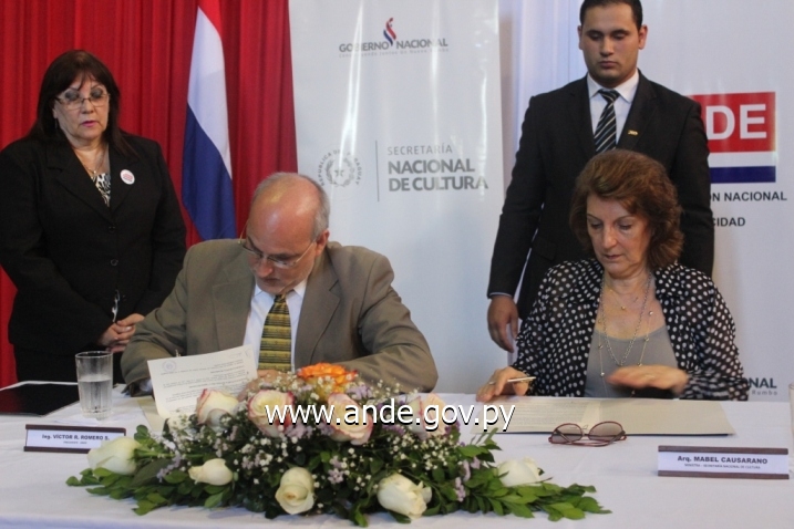 En la emblemática sede de la Estación Sajonia, se suscribió en la fecha un Convenio Marco de Cooperación Interinstitucional entre la Administración Nacional de Electricidad y la Secretaría Nacional de Cultura, que tiene por objeto desarrollar proyectos conjuntos, asesoramiento, apoyo técnico, capacitación de recursos humanos y participación en las iniciativas de las áreas que se enmarquen dentro de sus respectivos objetivos institucionales. Dicho documento fue suscrito por el titular de la ANDE, Ing. Víctor Raúl Romero Solis y la Ministra de la Secretaría Nacional de Cultura, Arq. Mabel Causarano.