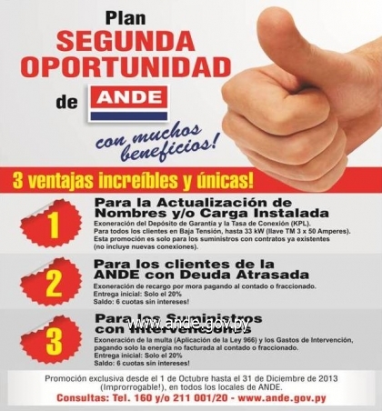 El pasado 30 de diciembre de 2013, culminó la promoción “Plan Segunda Oportunidad” que tuvo una duración de tres meses, desde el 1 de octubre del año pasado. La campaña incluía la actualización de carga instalada, con la exoneración del Depósito de Garantía y la Tasa de Conexión para los clientes en Baja Tensión, hasta 33 kW, para los suministros con contratos ya existentes. Un total de 21.638 clientes aprovecharon la promoción para dicha actualización, por un total de 201.780 kW de carga regularizada, mientras que 15.221 clientes realizaron los trámites de cambio de nombre o titular del Contrato por un total de 70.788 kW de carga actualizada.