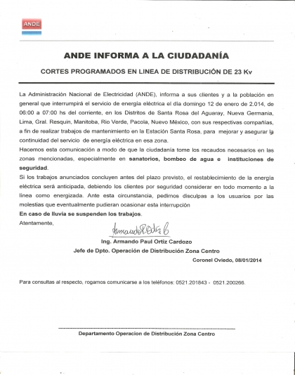 El domingo 12 de enero la ANDE efectuará trabajos de mejoría en la Estación Santa Rosa del Aguaray que afectará a los Distritos de Santa Rosa del Aguaray, Nueva Germania, Lima, Gral. Resquín, Manitoba, Río Verde, Pacola, Nuevo México y sus respectivas compañías.