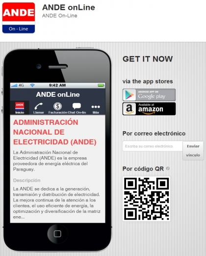 Obs: Durante la presentación se explicará detalladamente, cuáles son las opciones que podrán escoger los clientes de la Institución, a través de la aplicación ANDE Online, que estará disponible para todos los que posean teléfonos inteligentes o puedan acceder a la siguiente dirección electrónica: http://ande.mobapp.at
