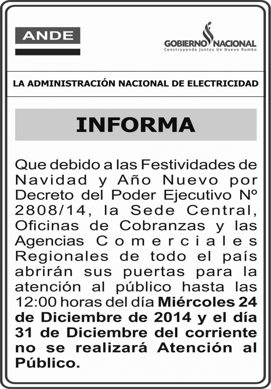 Que debido a las Festividades de Navidad y Año Nuevo por Decreto del Poder Ejecutivo N° 2808/14, la Sede Central, Oficinas de Cobranzas y las Agencias Comerciales Regionales de todo el país abrirán sus puertas para la atención al público hasta las 12:00 horas del día Miércoles 24 de Diciembre de 2014 y el día 31 de Diciembre del corriente no se realizará Atención al Público.