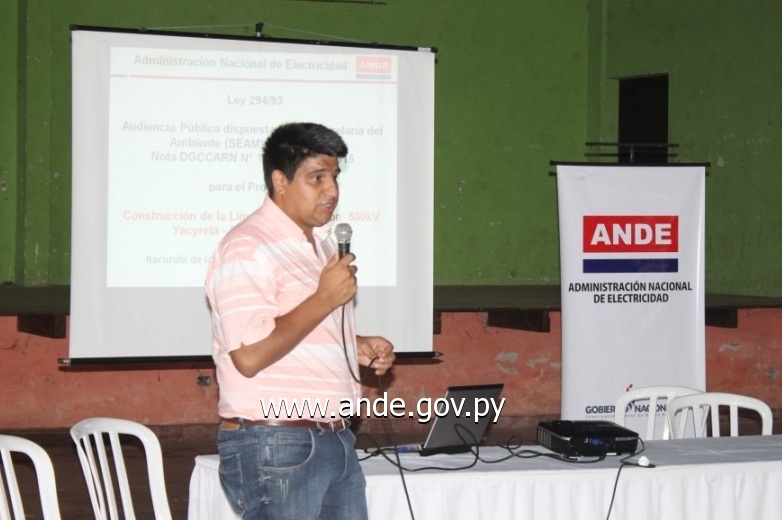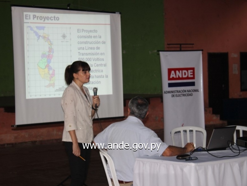 La presentación del proyecto estuvo a cargo de la Ing. Rocio Vely, en representación del proponente del Proyecto (ANDE) y el Estudio de Impacto Ambiental a cargo del Ing. Carlos Samudio, consultor ambiental de la empresa LEME Ingeniería.
