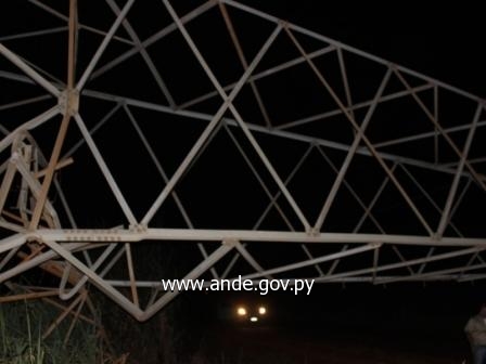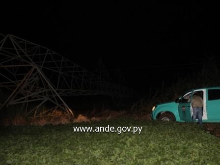 La Administración Nacional de Electricidad informa por este medio que el día domingo 15 de marzo de 2015, alrededor de las 14:30 horas, se normalizó totalmente el servicio de energía eléctrica en las zonas afectadas por la caída de una torre de 220 kV de la LT Paranambú-Carlos Antonio López ocurrido el sábado 14 de marzo alrededor de las 18:00 horas en la ciudad de Cedrales, y que provocó el corte de suministro de la energía eléctrica en varias localidades de la región Este y Sur del departamento del Alto Paraná así como en la zona norte de Itapúa. El evento había provocado el fuera de servicio de 14 alimentadores y afectó además a las zonas alimentadas por las Estaciones de Carlos Antonio López (ES CAL), Natalio (ES NAT), Paranambú (ES PNB) y a la Subestación Naranjal (SB NRJ), respectivamente.El servicio se restableció ese mismo sábado a las 22:00 horas aproximadamente, a excepción de un alimentador sobre el cual cayó la torre.