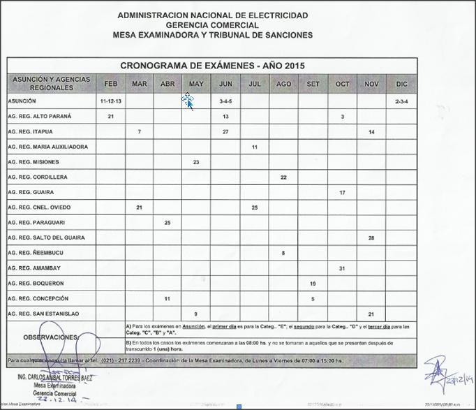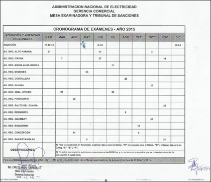 Los exámenes se administrarán en las agencias regionales ubicadas en el interior del país y en la capital, Sede Central, según el cronograma adjunto. Los requisitos para acceder a la categoría A: Ser Ingeniero Electricista, Electrotécnico o Electromecánico, presentar copia autenticada del título habilitante o constancia de haber culminado la carrera, expedida por la universidad donde concluyó la misma (esto en caso que el título se encuentre en trámite); los temas a ser examinados son pliego de Tarifas y Reglamento de Baja y Media Tensión.