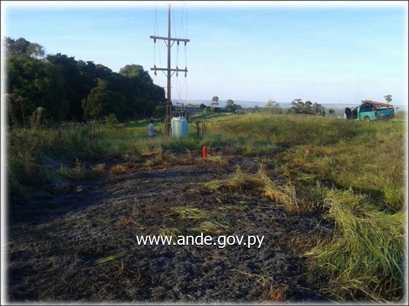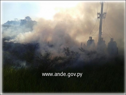 Tres elevadores de voltajes de 63 voltios de capacidad de la Administración Nacional de Electricidad (ANDE) ubicados en la ruta N° 10, zona de Río Corriente, de la ciudad de Capiibary, departamento de San Pedro, estuvo el pasado 23 de marzo de 2015 a centímetros de ser devorado por el fuego, a consecuencia de una quemazón provocada por inadaptados sociales.