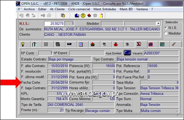 La verificación e intervención del suministro identificado con el NIS 2538270 a nombre del Sr. Néstor Fabián Cano, fue posible gracias a una denuncia anónima y se realizó en la mañana de hoy, viernes 31 de julio en el local donde funciona el Taller Piquillo, constándose la conexión directa sin medidor a la red de Baja Tensión de la ANDE, cuyo suministro había sido cortado por falta de pago de sus facturas en fecha 25/04/2014, como se observa en el Sistema Informático de la ANDE, permaneciendo conectado en forma clandestina de la red de ANDE desde entonces, y que ya había sido intervenido por la misma irregularidad en fecha 03/11/2014.