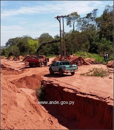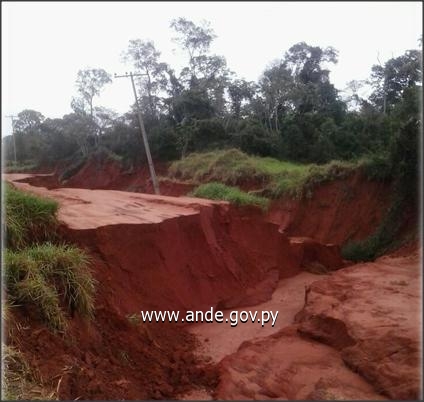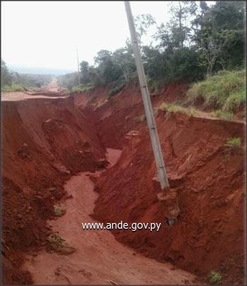 Debido a la erosión del terreno causado por las últimas lluvias que afectaron parte del territorio del Departamento de Amambay, la Administración Nacional de Electricidad (ANDE) deberá realizar obras de traslado de 980 metros de la línea de Media Tensión de 3 x70 mm2, en el tramo Arroyito –Pacola, camino Santa Rosa – ciudad de Capitán Bado, del citado departamento.