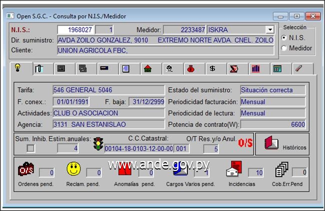 El suministro identificado con el NIS 1968027 a nombre de UNIÓN AGRÍCOLA FBC, con actividad Club o Asociación, fue intervenido el pasado viernes 11 de setiembre de 2015, por la irregularidad descrita como conexión directa con medidor en Media Tensión, mediante un Transformador de 250 kVA, conectado en forma directa a la red de Media Tensión, con instalación preparada para el medidor correspondiente, que hasta la fecha tiene su potencia de contrato en Baja Tensión, de apenas 6.600 W.