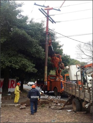 Prosiguiendo con los trabajos de mejoramiento del sistema eléctrico, el pasado fin de semana, técnicos de la Administración Nacional de Electricidad realizaron diversos trabajos de mantenimiento de líneas de distribución en Asunción y área Metropolitana, así como en el Sur del país.