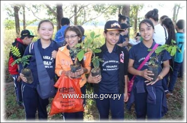 Cumpliendo con su compromiso social y ambiental, la Administración Nacional de Electricidad junto con alumnos del segundo Ciclo de la Escuela Mariscal López, ubicada en el distrito de Yguazú, Departamento de Alto Paraná, participaron de la plantación de especies forestales nativas, en el marco del Proyecto de Fortalecimiento de la Gestión Integrada de la Cuenca del Lago Yguazú- Plan Yguazú Porã- ejecutado en forma conjunta por la Agencia de Cooperación Internacional del Japón (JICA) y ANDE.