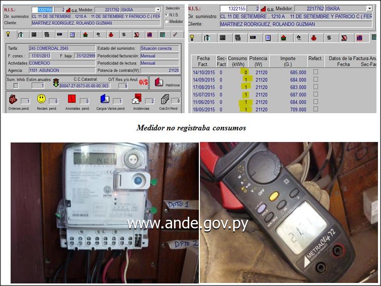 Prosiguiendo con las actividades del día, fue verificado el suministro identificado con NIS 1322155 que en el sistema informático de la ANDE figura a nombre del Cliente ROLANDO GUZMAN MARTINEZ RODRIGUEZ,ubicado en la calle 11 de Septiembre N° 1210 de la Ciudad de Fernando de la Mora. Se trata de un comercio (Bodega), en el cual se detectó "Conexión directa con medidor" con conductores de 3x6mm2 (fases R.S.T. + neutro) en borne de entrada del medidor con carga de IR: 3,1A; IS: 9,2A; IT: 21,7A en el momento de la verificación. Por la irregularidad detectada se procedió a labrar Acta de Intervención N° 9017/15 y notificar al afectado con Cédula de Notificación N° 85.098, luego se procedió a normalizar el servicio y a precinta tapa borne del medidor con sellos N° MDR 704927 y 704928.