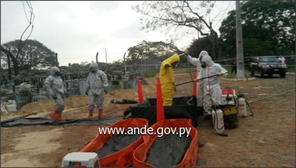 Este lunes 26 de octubre, se cumple el cuarto día de trabajos ejecutados en la sede de ANDE, en San Lorenzo, para la recolección de los residuos contaminados tras el proceso de contención de los efluentes y derrames de aceites dieléctricos a fin de evitar que sean arrastrados por la lluvia hasta lugares no contaminados tras el accidente del pasado miércoles 14 de octubre.