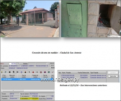 En fecha 23 octubre pasado, el suministro identificado con NIS 1687289 que responde a la actividad residencial fue detectado con una conexión directa sin medidor y está ubicado en Boquerón 3 – La Merced, Barrio Cerrito, de la ciudad de San Antonio. La titular del contrato es la Sra. Ramona Vda. de González y por la irregularidad detectada se procedió a labrar Acta por Intervención y de Notificación, para luego proceder al corte y retiro de la conexión irregular.
