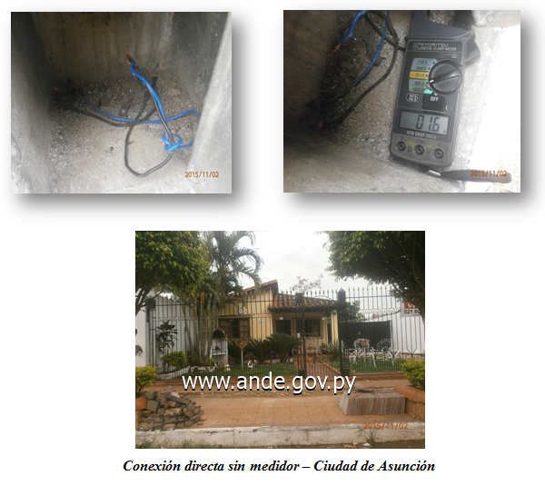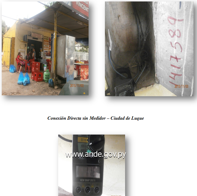 Los Técnicos/Fiscalizadores de la ANDE procedieron a verificar el día 3 de noviembre pasado, el suministro identificado con NIS 1427843, que corresponde al cliente RODRIGO RENÉ GUERRERO SANABRIA y OTROS, usuario servido en Baja Tensión, ubicado en la dirección La Paz N° 9027 c/ Washington de la Ciudad de Luque. Durante la verificación de detectó “CONEXIÓN DIRECTA SIN MEDIDOR”, con conductores de 4x10 mm2 (fases R, S, T y N), con cargas de (3,3 A – 0,4 A – 0,3 A), llave limitadora con capacidad de 3x30 A.