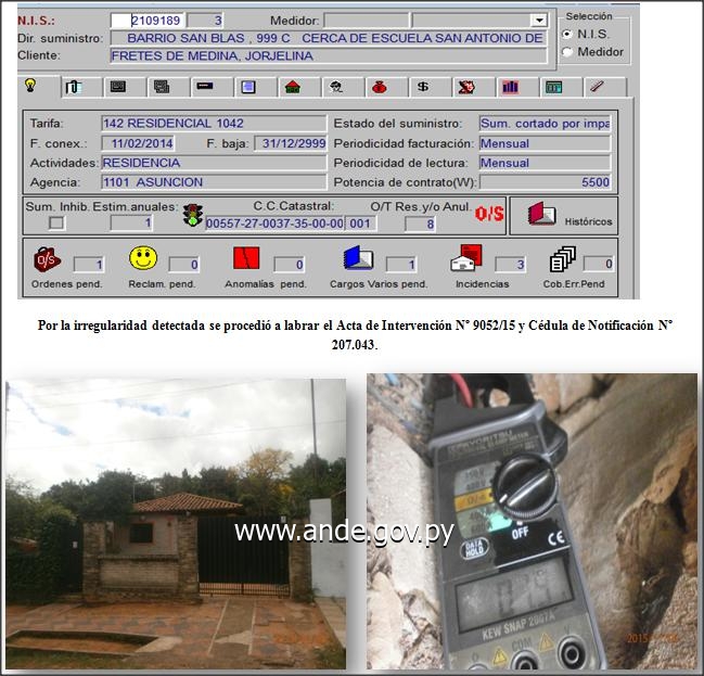 Prosiguiendo con el cronograma de trabajo establecido por la División de Gestión de Pérdidas Eléctricas de la Gerencia Comercial, el pasado 5 de noviembre también se realizó una verificación e intervención delsuministro identificado con N.I.S. 2.109.189, CLIENTE: JORGELINA FRETES DE MEDINA, ubicado en la calle San Blas Nº 557, de la ciudad de San Antonio, en el Dpto. Central. El mismo está registrado para actividad residencial y tras la comprobación de una conexión directa sin medidor y la existencia de conductores de 2 x 6 mm2 (fase + neutro), con carga de 1,9 Amperios en el momento de la verificación y llave TM 1 x 25 Amperios, se realizó el corte del suministro eléctrico y retiro de la conexión irregular.