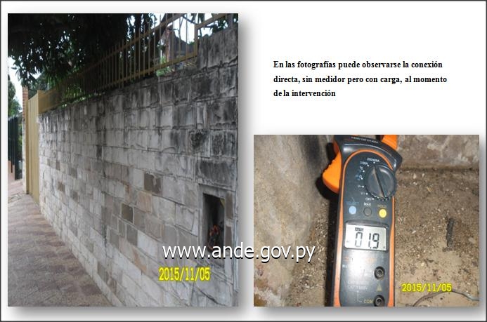 En ese contexto, el día 5 de noviembre pasado, los interventores procedieron a la revisión de medidor e inspección por presunto fraude, del suministro identificado con NIS 1.194.945, cliente: JUANA GIMÉNEZ MERCADO, que ya había sido retirado en una oportunidad anterior (baja por impago). El mismo está ubicado en la dirección: Tte. Juan Ramón Lesme Nº 1837 c/ Mayor Fleitas), Barrio Republicano, perteneciente a la ciudad de Asunción – Zona 11 y registrado para Actividad residencial, con potencia de contrato 8.800 vatios, en el cual se detectó “CONEXIÓNdirecta sin medidor”, con conductores 2 x 4 mm2 (fase + neutro), con carga de 1,9 Amperios en el momento de la verificación y llave TM sin acceso.